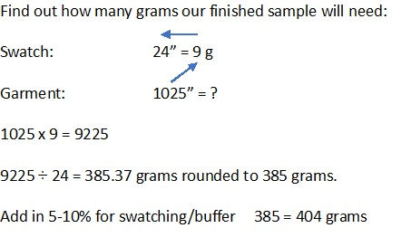My 24 square inch swatch uses 9 grams of Gloss. Next calculate how many square inches the sample size that you're making will be. You’ll get these measurements from your schematic or grading worksheet. For set-in sleeves and raglans, there is more to consider with cross back measurements and sleeve caps, but for this example, I’m using the simplest silhouette, the drop shoulder sweater: Overall length x circumference plus each sleeve (cuff circumference + upper arm circumference, then divide by 2 for the average circumference then multiply by sleeve length). Don’t forget to add in both sleeves. My sweater is 1025 square inches.